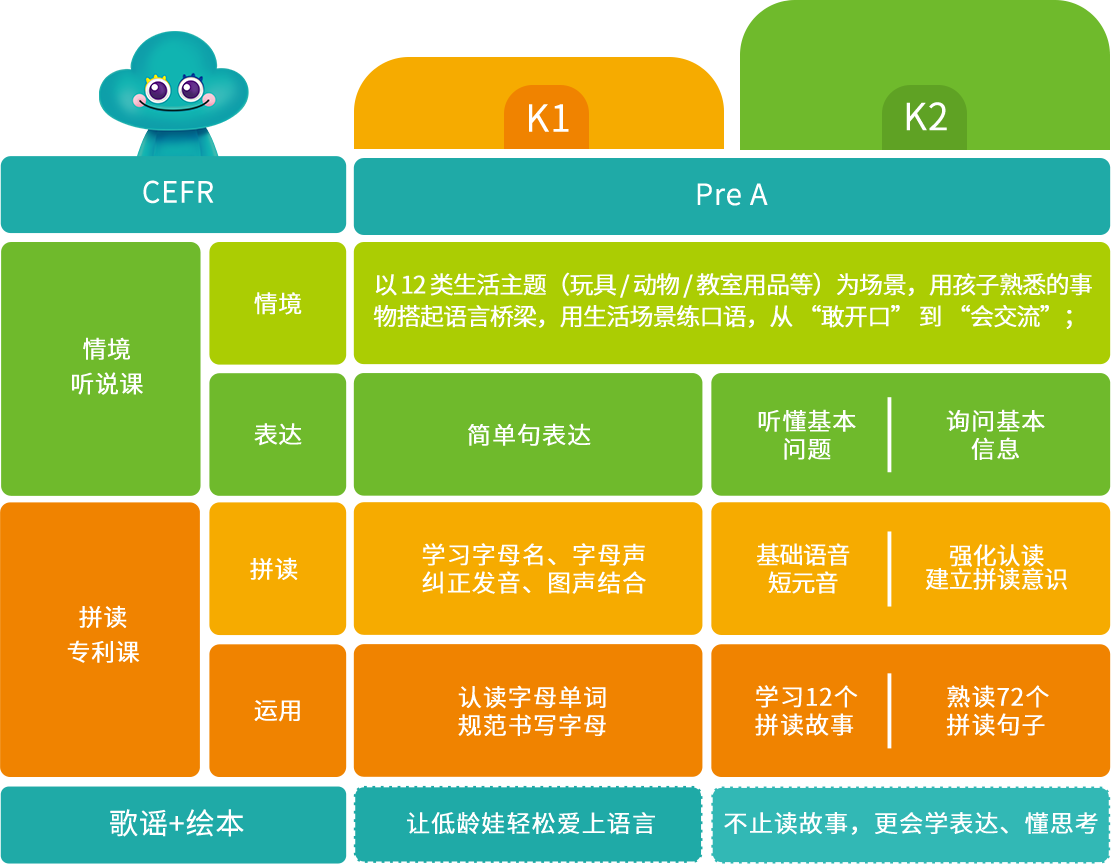 自研科学双语体系,绘本 + 歌谣 + 拼读 + 口语分级进阶,沉浸式多感官互动高效提能力